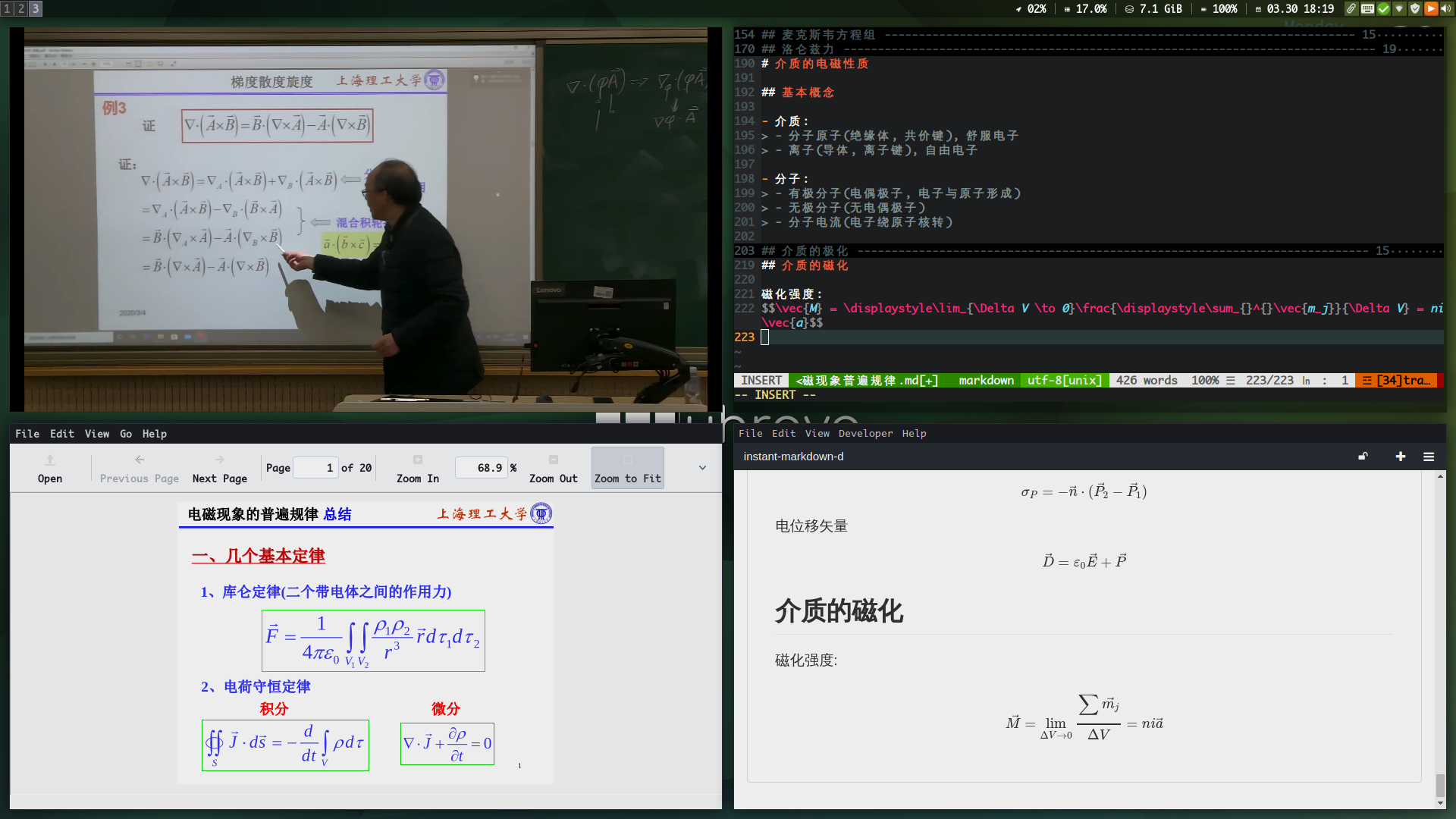 因为一只蝙蝠, 三月初网上开学, 到现在一个月了, 分享一下我用i3wm + neovim + markdown记笔记的成果, 先说一下感受吧